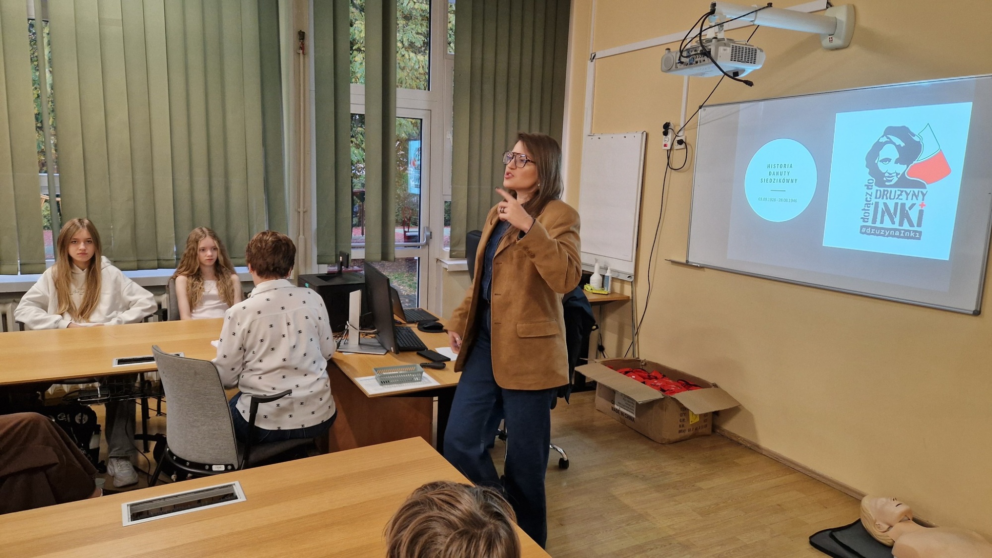 24 października 2025 r. uczniowie klas 7 i 8 wzięli udział w kolejnej edycji projektu „Drużyna Inki”, zorganizowanego przez Instytut Pamięci Narodowej. To wyjątkowe zajęcia, które w ciekawy sposób łączą naukę historii z praktycznymi umiejętnościami niesienia pomocy.Podczas spotkania uczniowie poznali poruszającą historię Danuty Siedzikówny „Inki” – młodej sanitariuszki Armii Krajowej, która stała się symbolem odwagi, honoru i wierności wartościom. W drugiej, praktycznej części warsztatów młodzież uczestniczyła w pokazie udzielania pierwszej pomocy i RKO, ucząc się, jak reagować w sytuacjach zagrożenia życia.